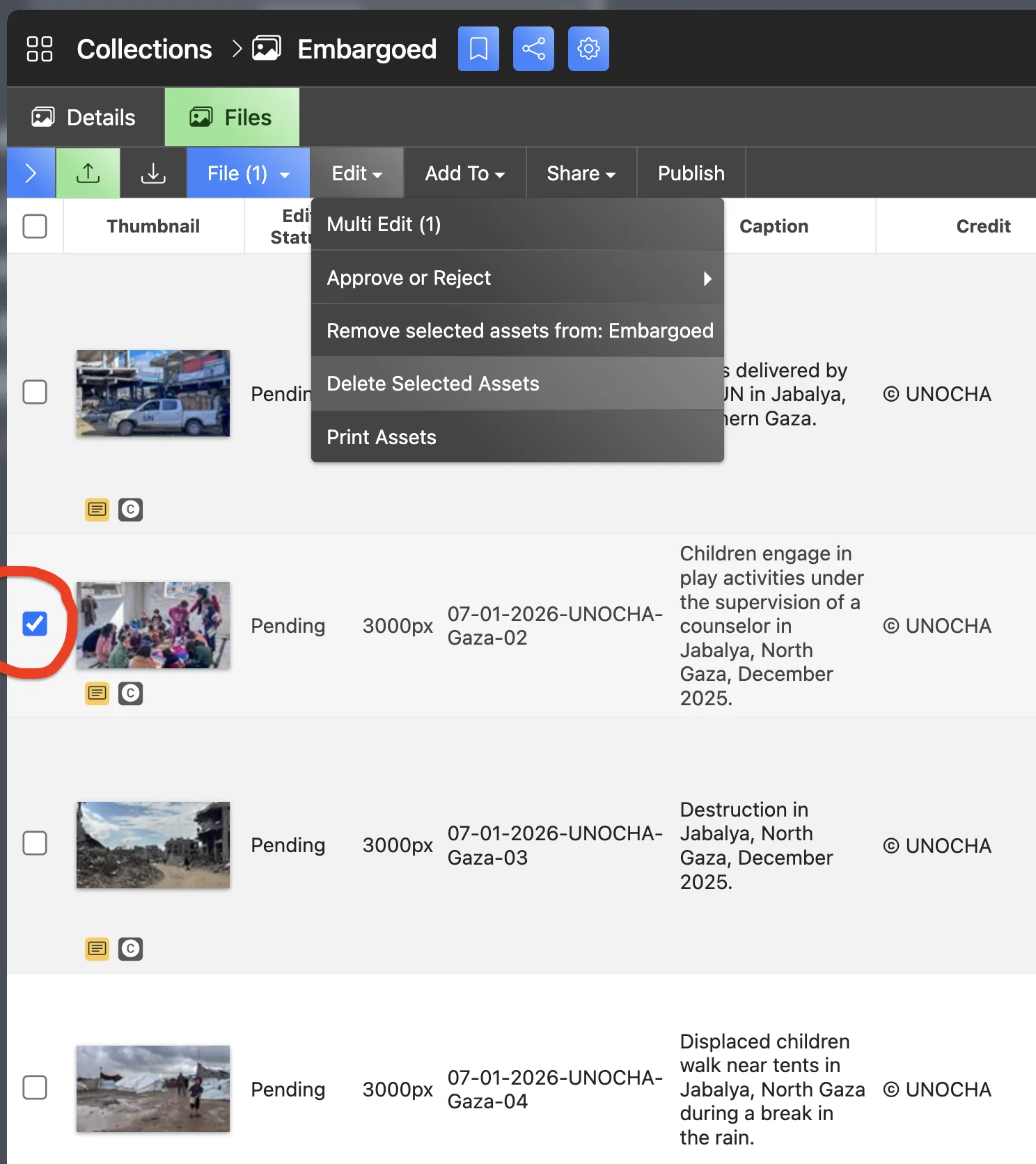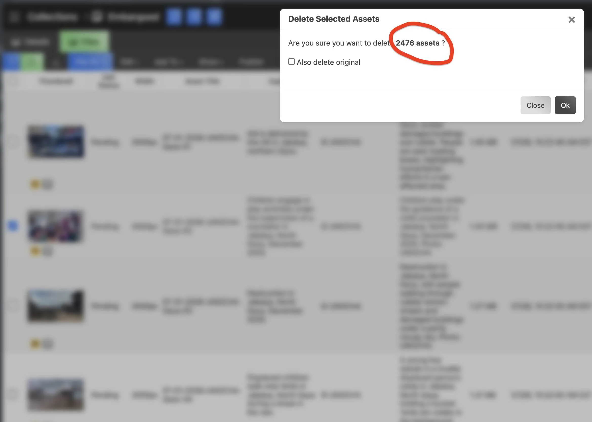 Hi EMedia Team - not sure if this is the correct place to report the issue but I noticed when working with the new backend: https://unitednations.entermediadb.net/assets/find/views/modules/librarycollection/index.html?entityid=AWldxpeyqazlMTv9zh9y deleting individual assets is no problem and works fine but if if I wish to delete items from the list view I select the assets I wish to delete by checking the boxes on the left but when I go to Edit -> Delete Selected Assets in the 'are you sure' prompt that pops up it seems to have selected All Assets in the folder! (for the Embargoed folder that is 2470 assets) I did not proceed so not sure if they will all be deleted or not but wanted to alert you to this issue. Thanks for looking into it. Matt